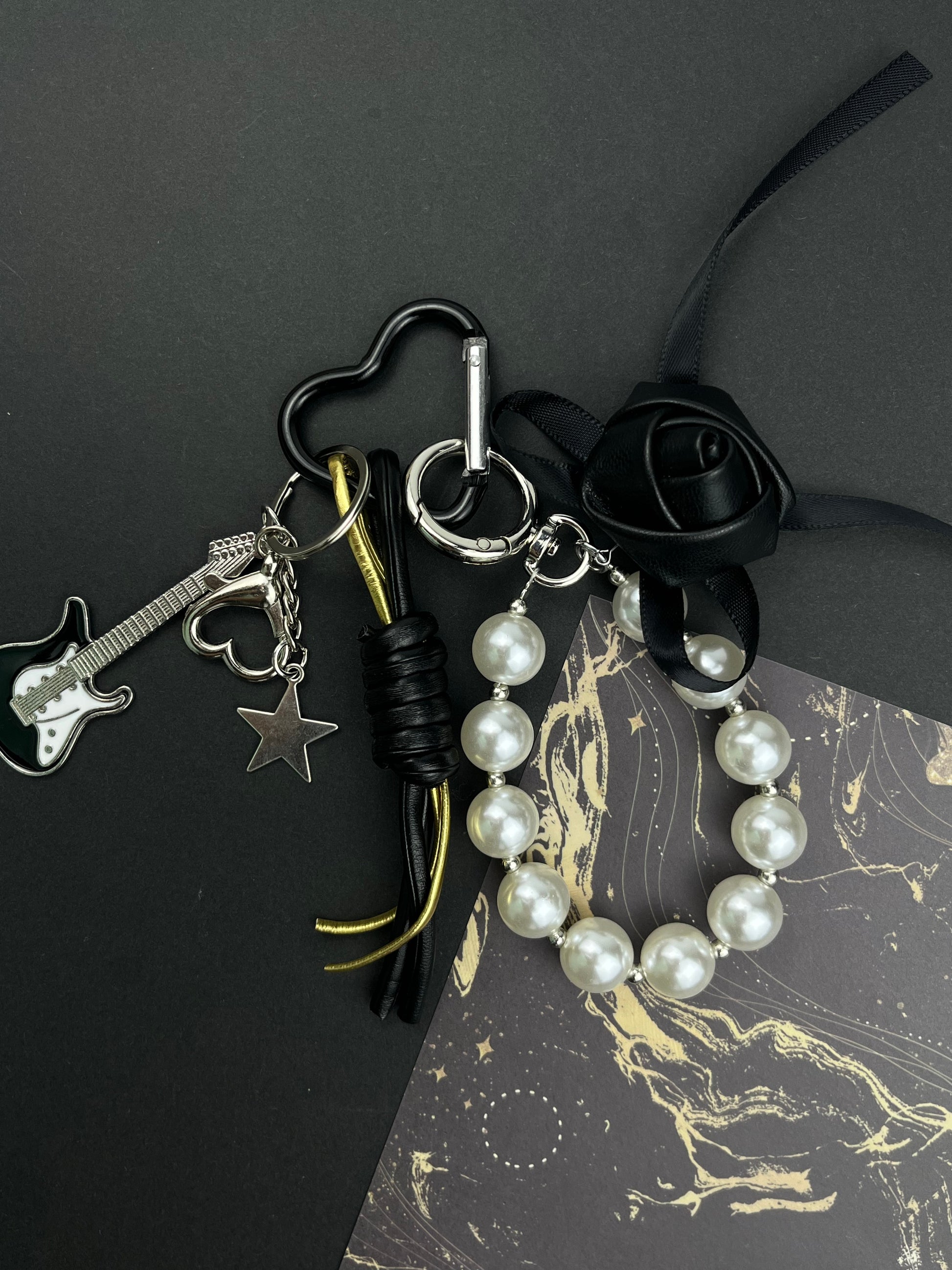 Cool Black Rose Pearl Keychain | Guitar Charm + Metal Accessories, Full of Personality